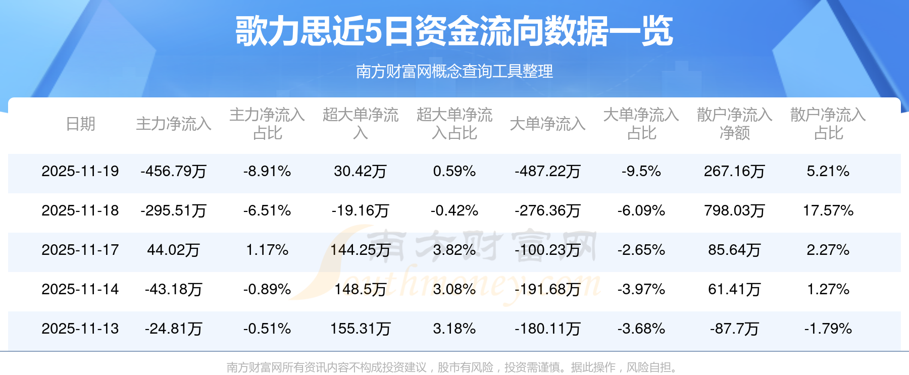 11月19日消息,歌力思11月19日主力资金净流出456.79万元,超大单资金净流入30.42万元,大单资金净流出487.22万元,散户资金净流入267.16万元。