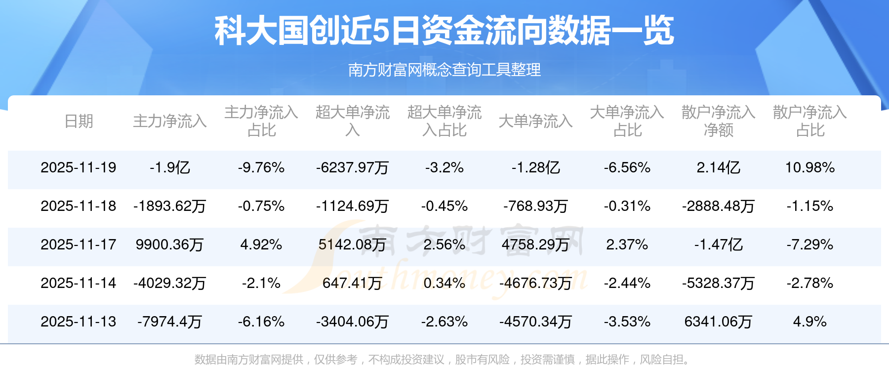11月19日消息,科大国创主力净流出1.9亿元,超大单净流出6237.97万元,散户净流入2.14亿元。