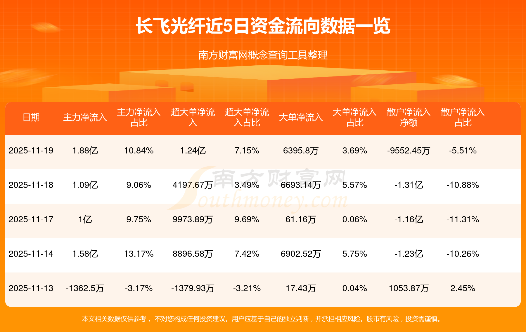 11月19日消息,长飞光纤主力资金净流入1.88亿元,超大单资金净流入1.24亿元,散户资金净流出9552.45万元。