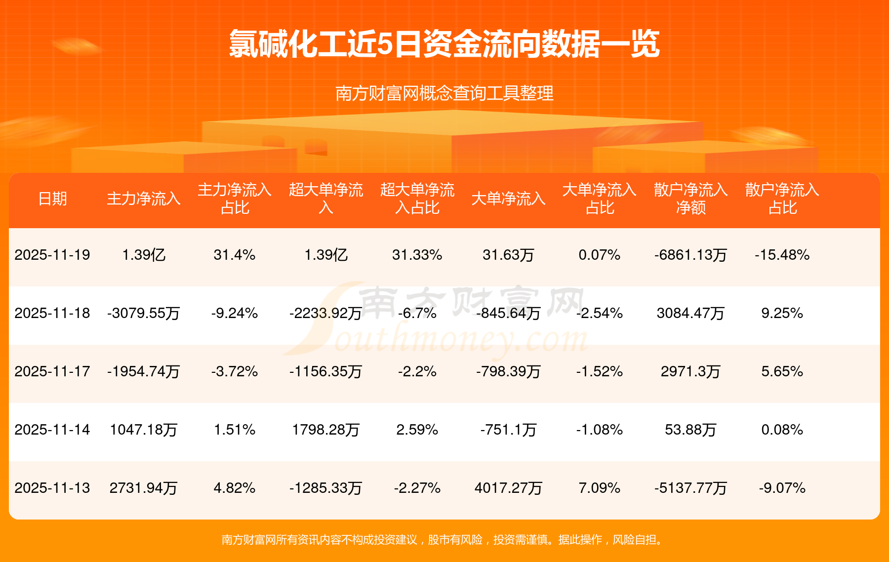 11月19日消息,氯碱化工资金净流入1.39亿元,超大单资金净流入1.39亿元,换手率4.2%,成交金额4.43亿元。