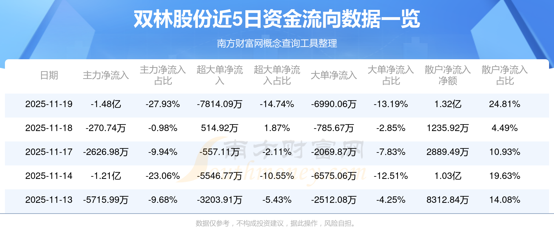 11月19日消息,双林股份主力资金净流出1.48亿元,超大单资金净流出7814.09万元,散户资金净流入1.32亿元。