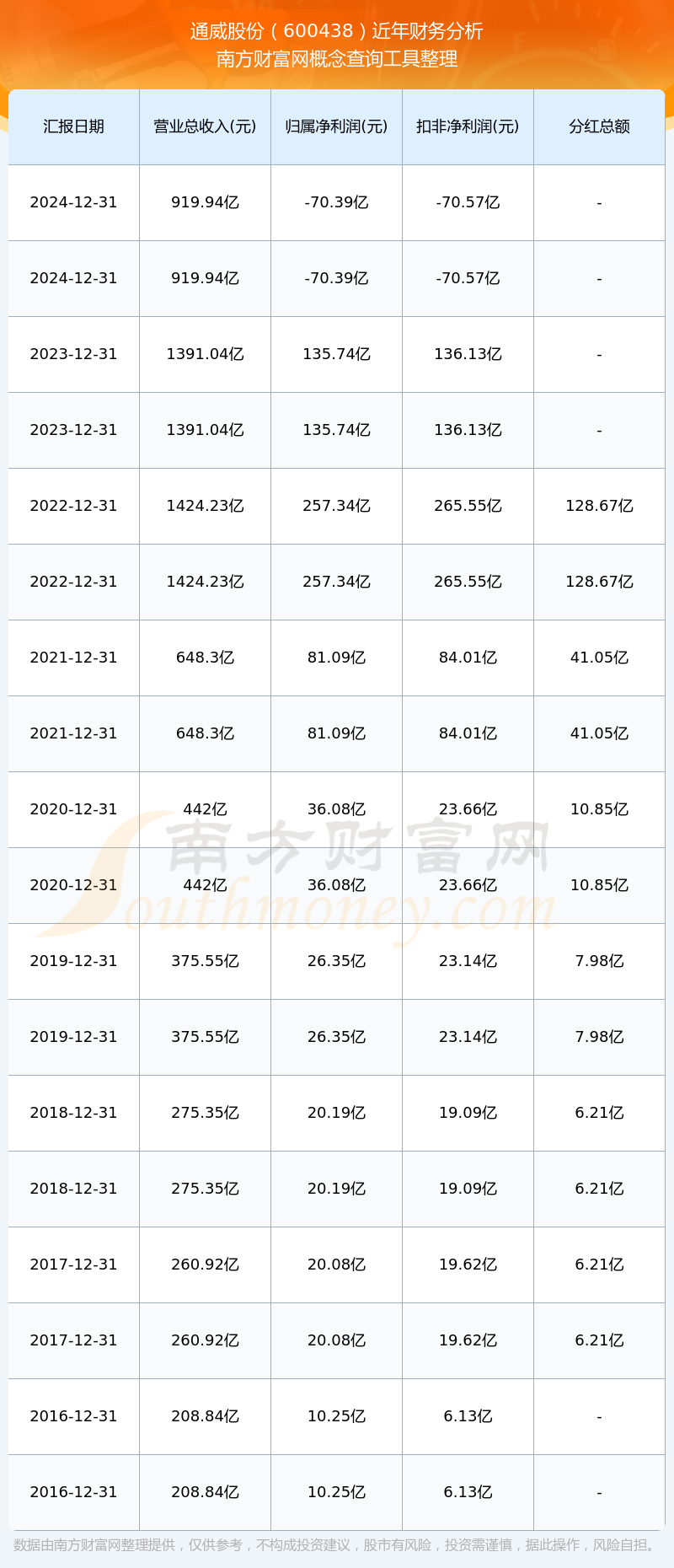 通威股份2024年总营收919.94亿,同比增长-33.87%;净利润-70.39亿,同比增长-151.86%;销售毛利率6.39%。