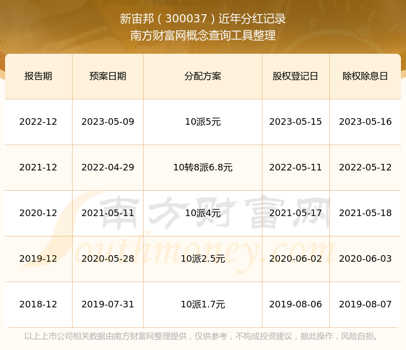 新宙邦最新一次公布的分红方案为10派5元。本次权益分派股权登记日为2023年5月15日,除权除息日为2023年5月16日,派息日为2023年5月16日。