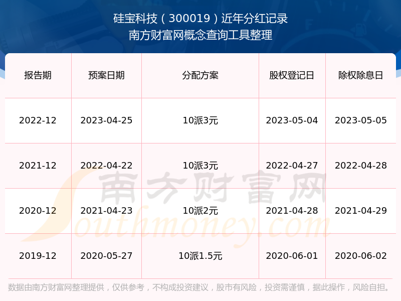 硅宝科技最新一次公布的分红方案为10派3元。本次权益分派股权登记日为2023年5月4日,除权除息日为2023年5月5日,派息日为2023年5月5日。