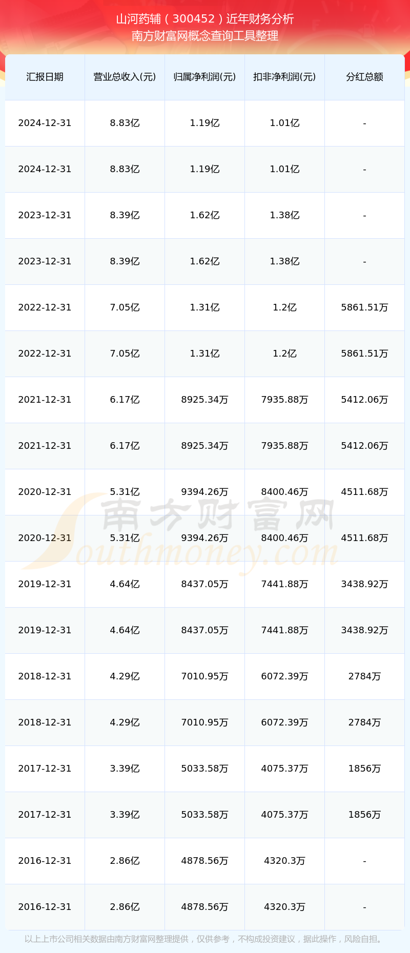 山河药辅2024年总营收8.83亿,同比增长5.16%;净利润1.19亿,同比增长-26.07%;销售毛利率31.04%。