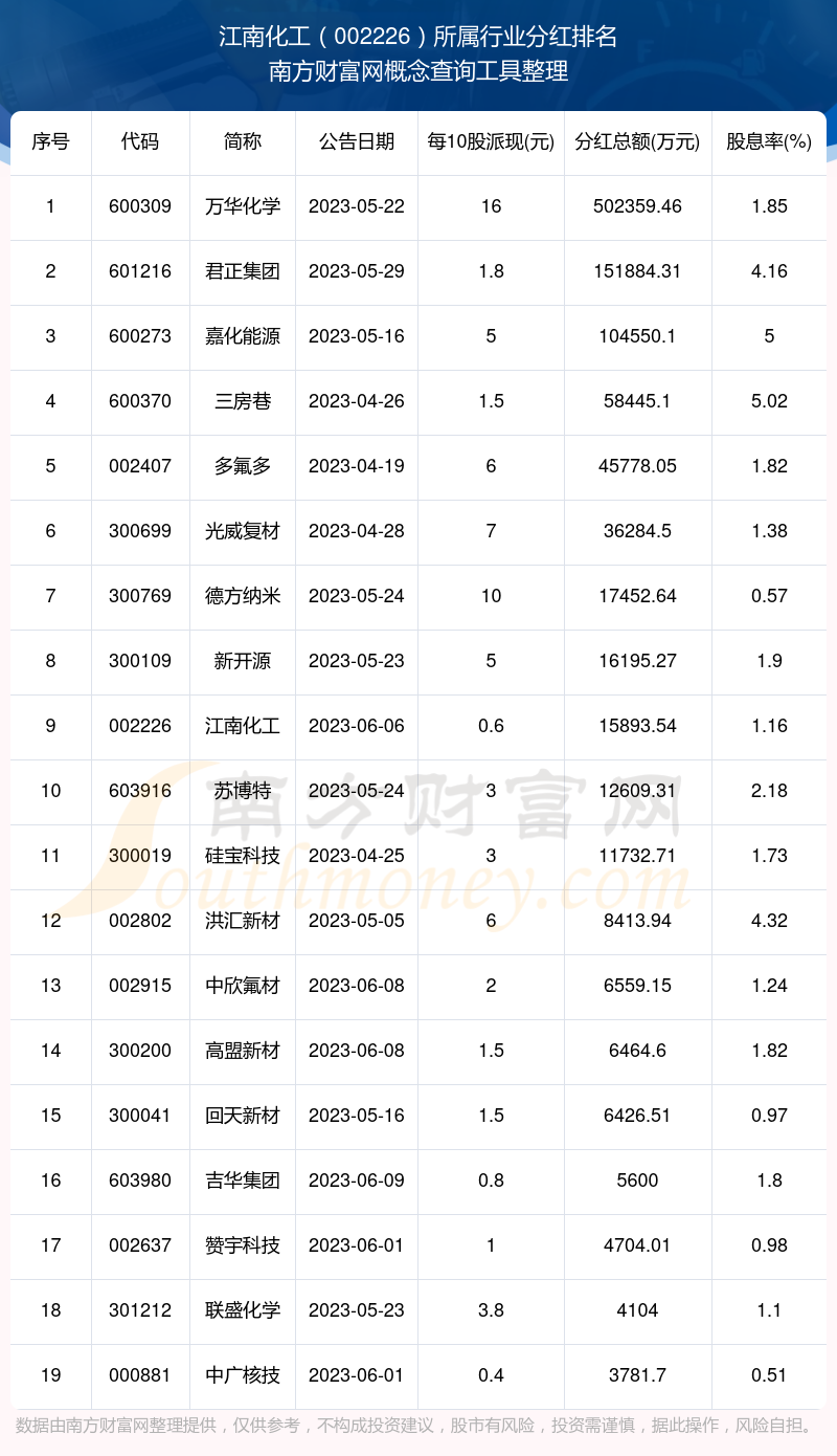 二、江南化工002226行业分红排名