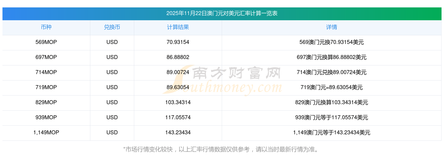 2025年11月22日汇率行情:38澳门元对美元汇率多少