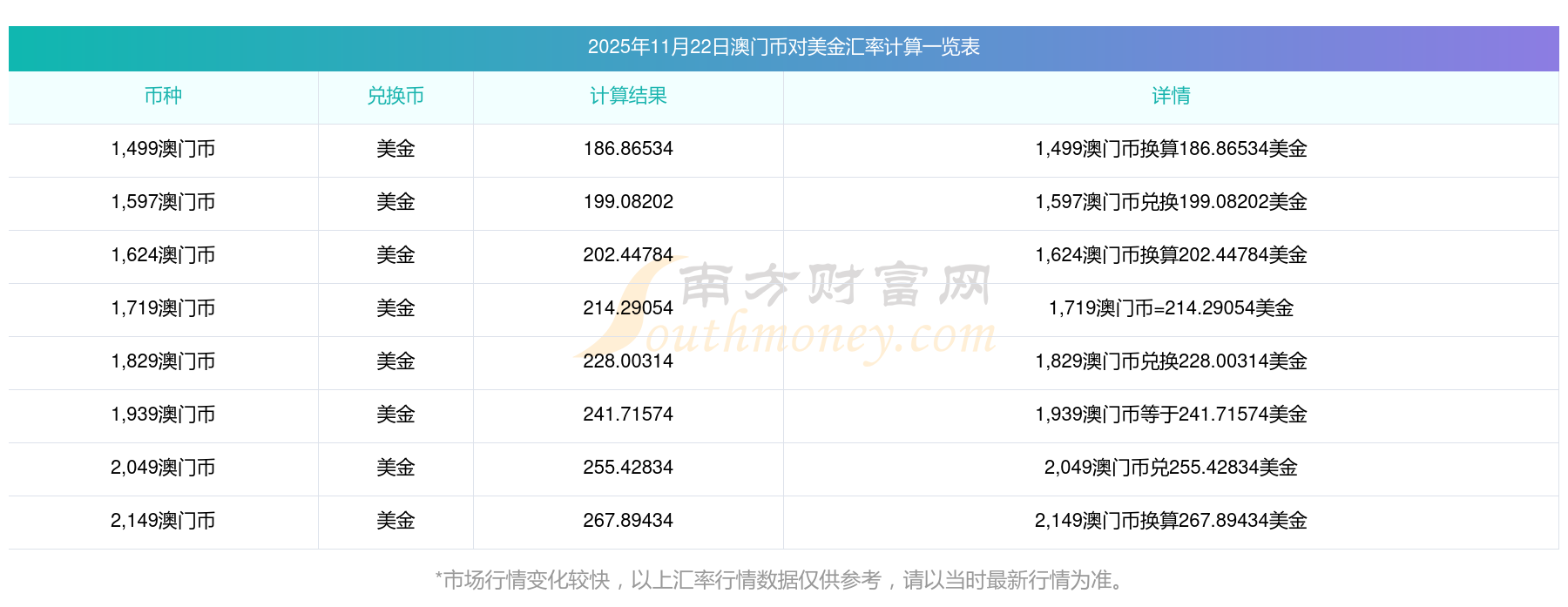2025年11月22日汇率行情:43澳门币对美金汇率多少