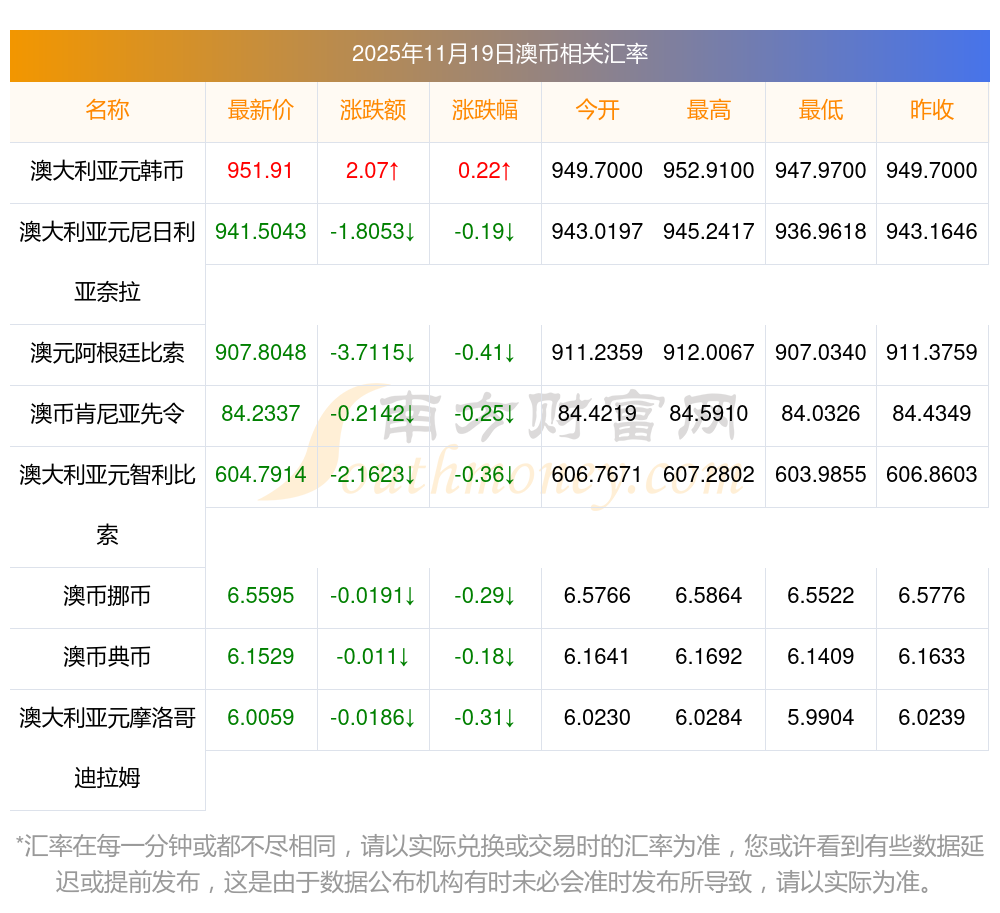 根据2025年11月19日汇率计算,澳币兑换新币汇率最新价0.845900,今开价0.8470,昨收价0.8472,最高价0.8480,最低价0.8437。