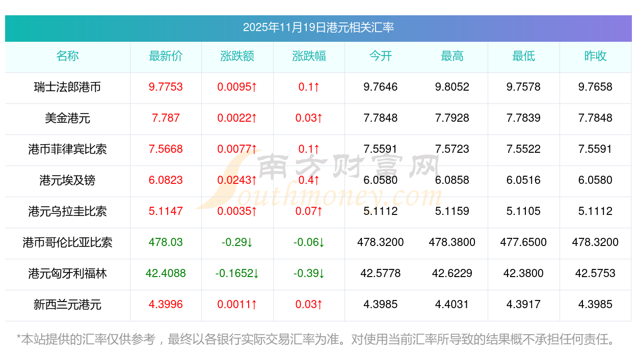 2025年11月19日最新消息,港元兑换匈牙利福林最新汇率为42.408830,今开为42.5778,昨收为42.5753,最高为42.6229,最低为42.3800。