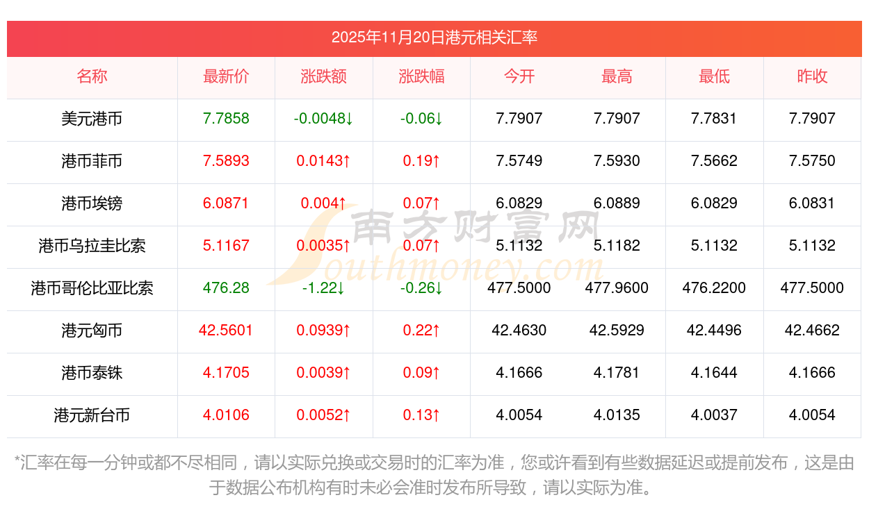 根据2025年11月20日汇率,港元兑换墨币汇率最新价2.357510,今开价2.3539,昨收价2.3541,最高价2.3590,最低价2.3531。