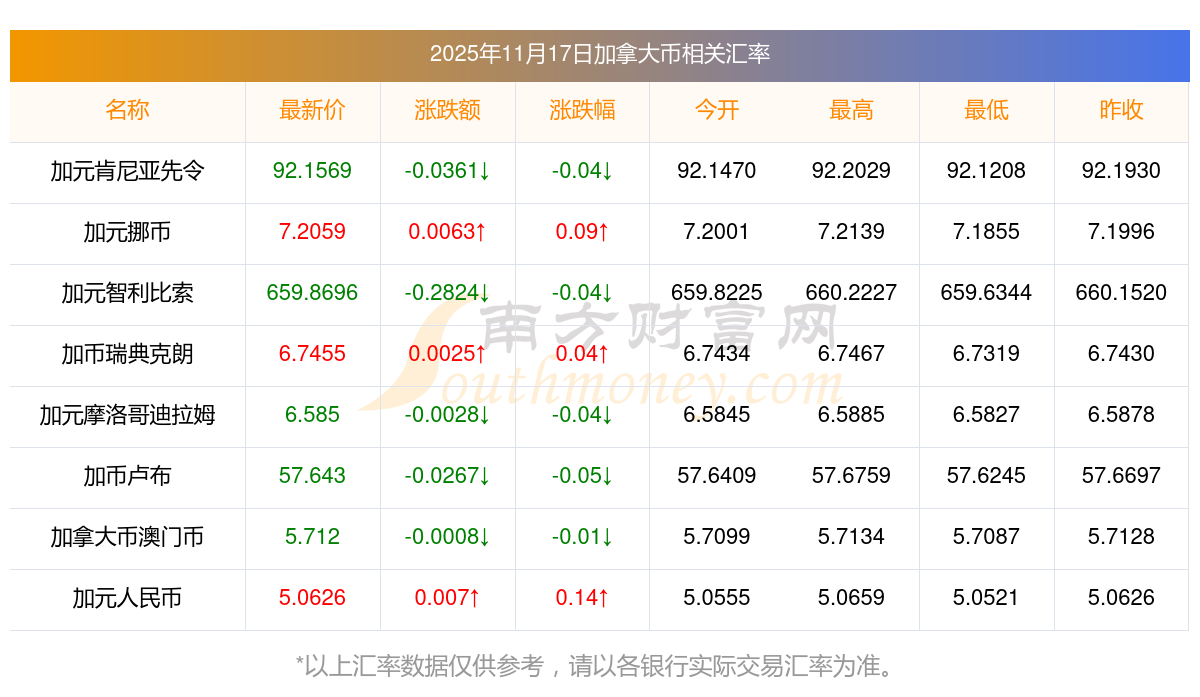 根据2025年11月17日汇率,加拿大币兑换菲律宾比索汇率最新42.090000,今开42.1200,昨收42.1400,最高42.1400,最低42.0800。