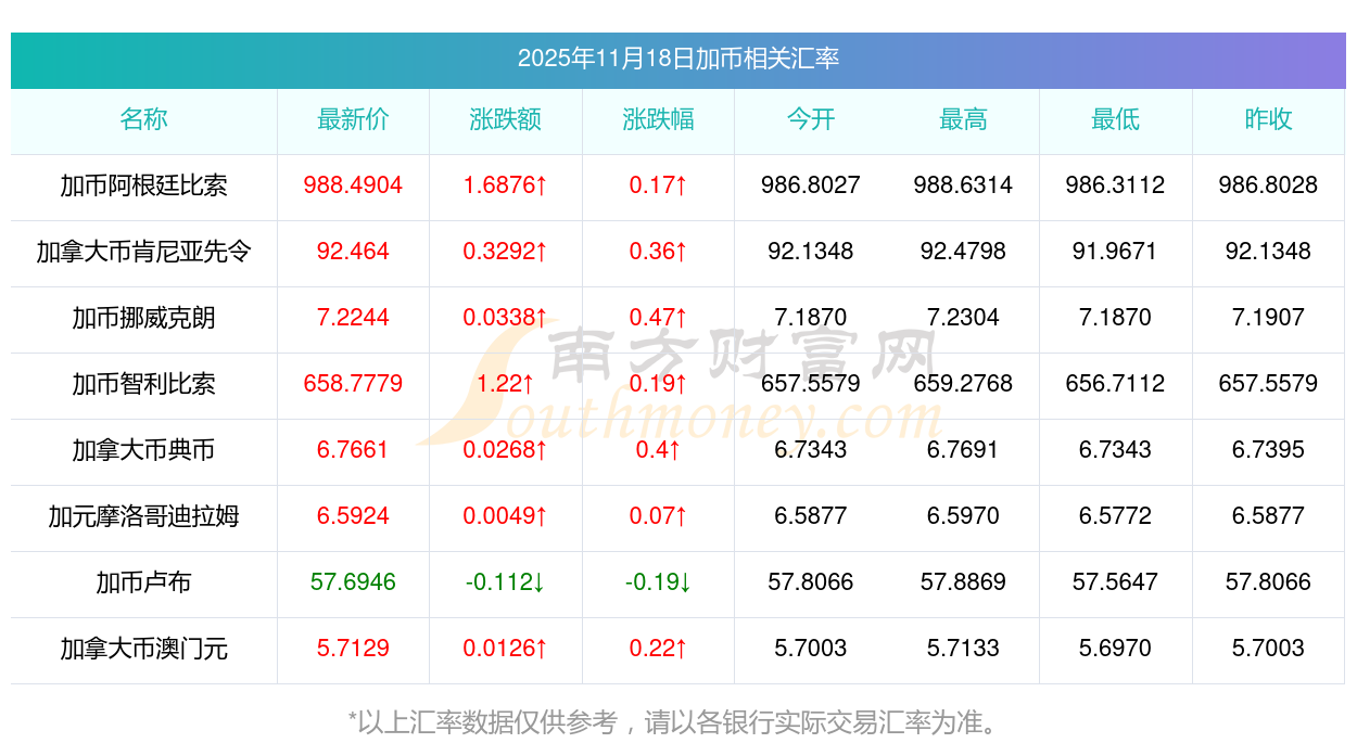2025年11月18日加币兑换阿根廷比索最新汇率:988.490400,今开:986.8027,昨收:986.8028,最高:988.6314,最低:986.3112。