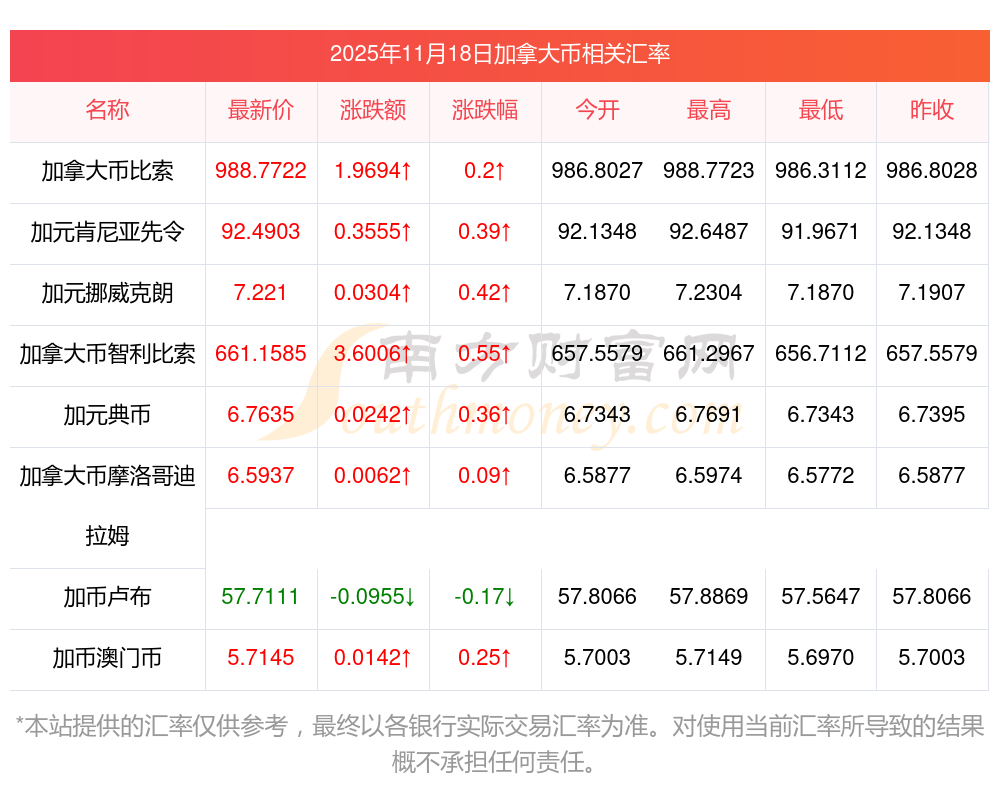 2025年11月18日加拿大币相关汇率查询