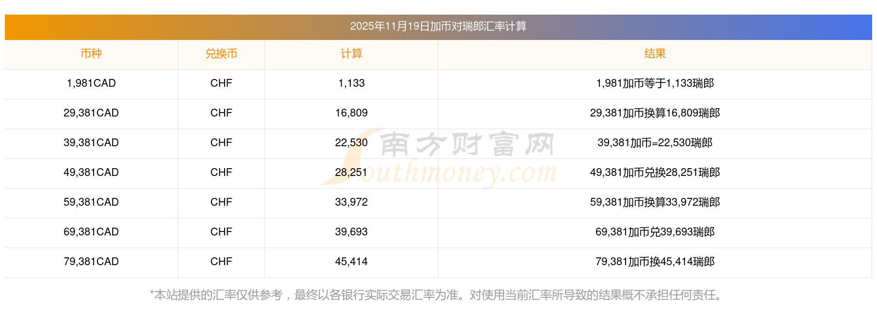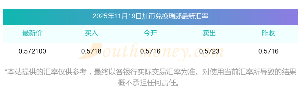 今日加币汇价:2025年11月19日29加币兑瑞郎汇价一览表