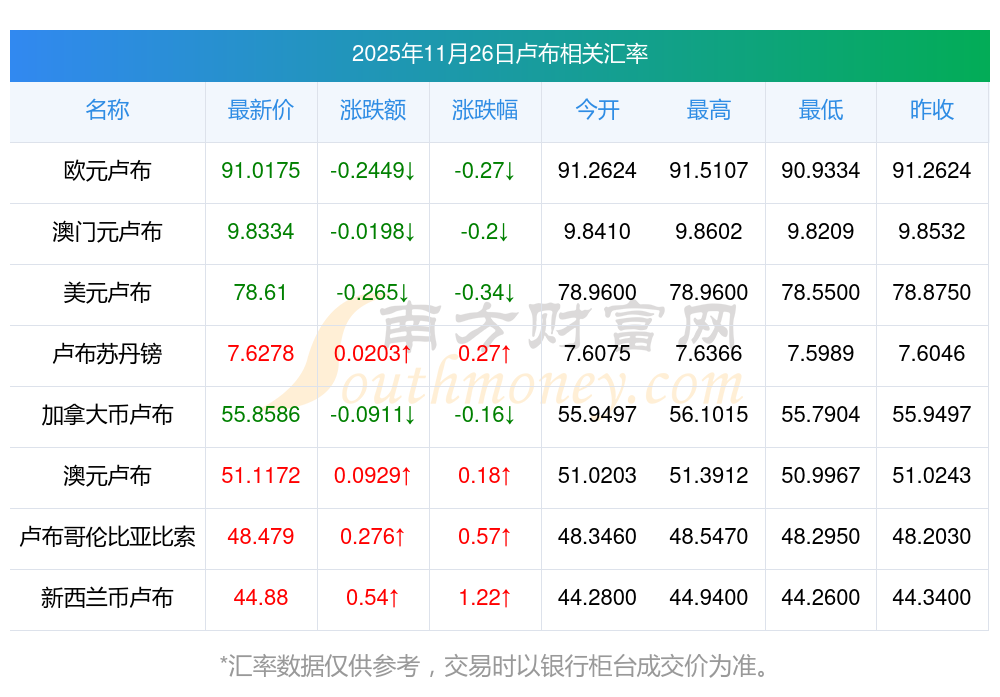 2025年11月26日最新消息,卢布兑换波兰兹罗提最新汇率为0.046600,今开为0.0463,昨收为0.0463,最高为0.0466,最低为0.0462。