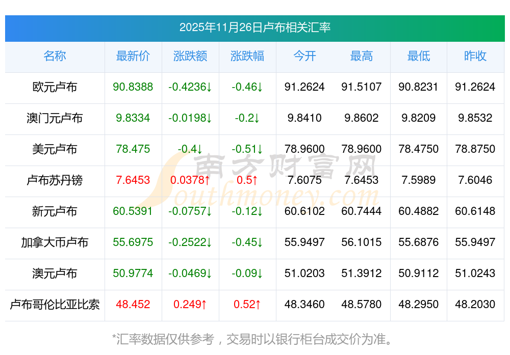 根据2025年11月26日汇率,卢布兑换刚币汇率最新29.020000,今开28.8700,昨收28.8700,最高29.0200,最低27.9600。