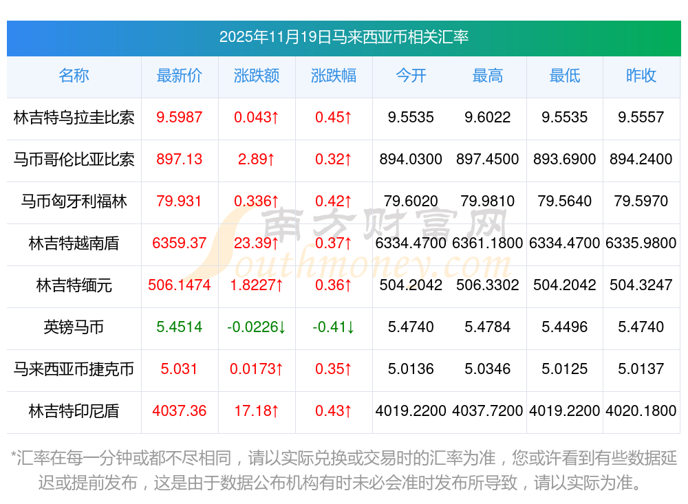 2025年11月19日马来西亚币兑换瑞士法郎最新汇率:0.192980,今开:0.1921,昨收:0.1920,最高:0.1930,最低:0.1919。
