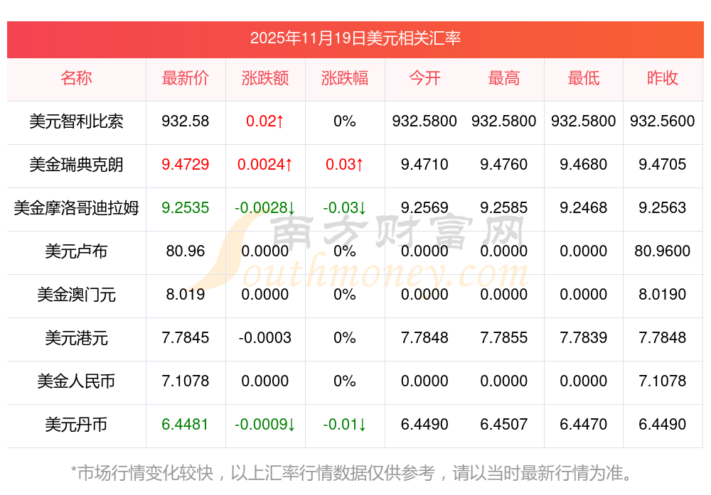 2025年11月19日美元相关汇率查询