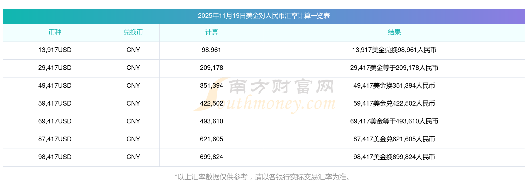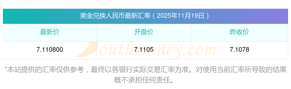 今日汇价2025年11月19日:3美金兑人民币汇价表