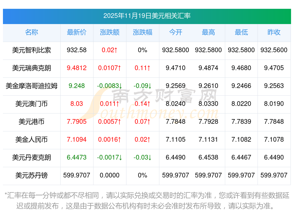 2025年11月19日美元相关汇率查询