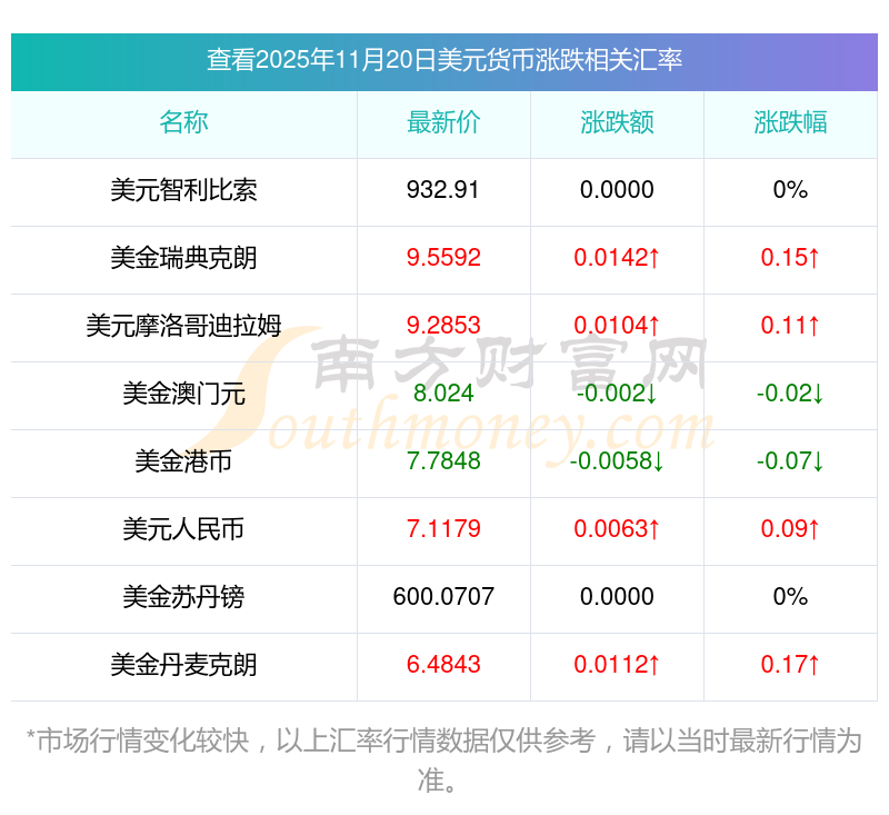 2025年11月20日美元相关汇率查询