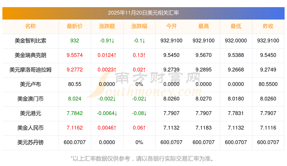 2025年11月20日美元相关汇率查询