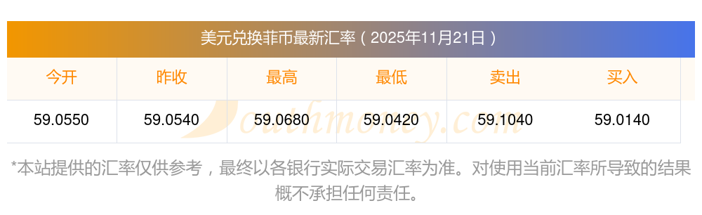 2025年11月21日美元兑换菲币的汇率为:59.059