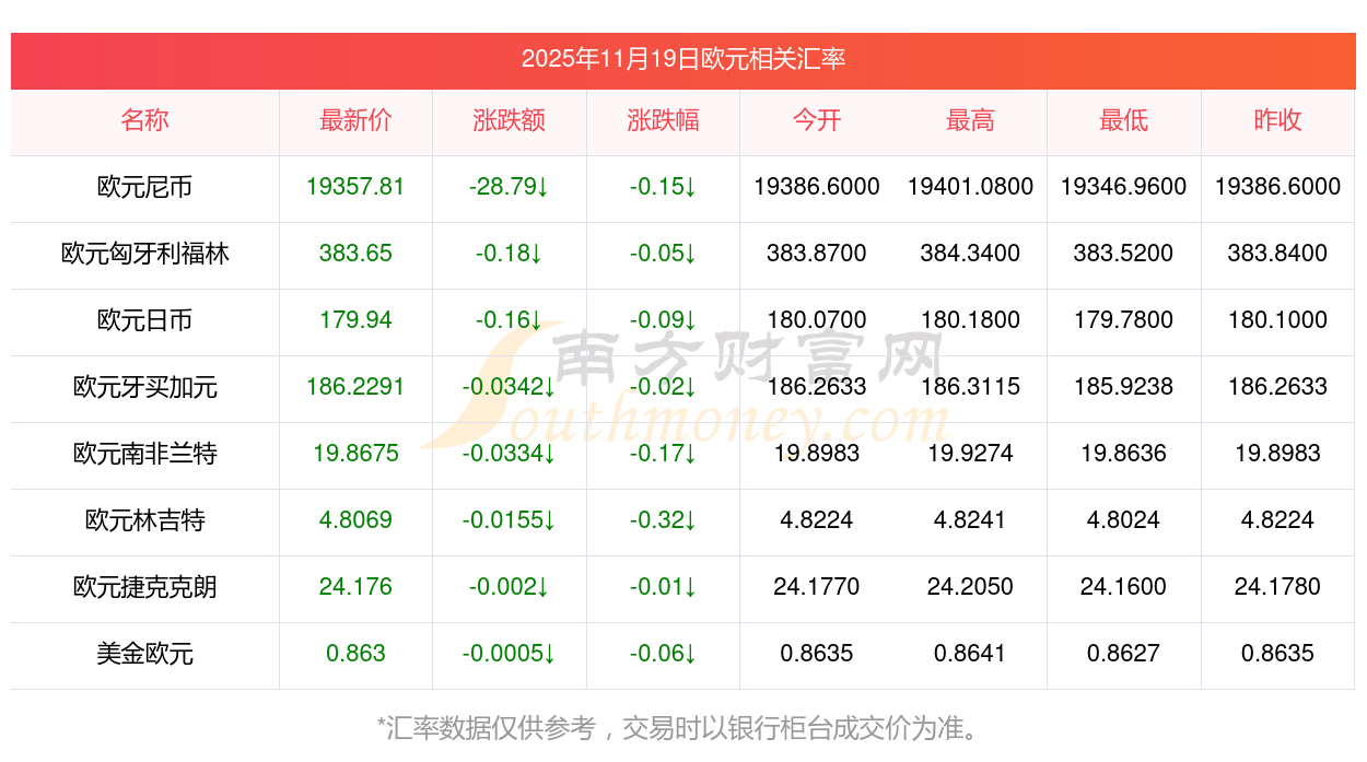 根据2025年11月19日汇率,欧元兑换林吉特汇率最新4.806900,今开4.8224,昨收4.8224,最高4.8241,最低4.8024。