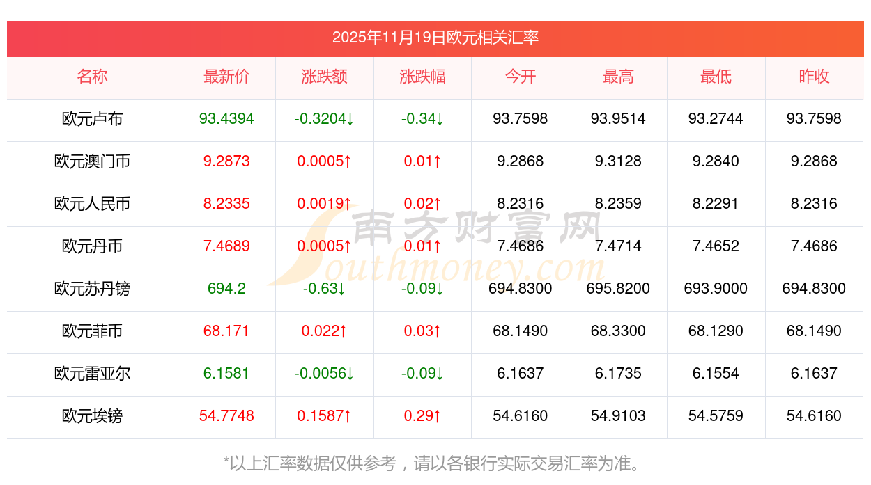 2025年11月19日欧元相关汇率查询