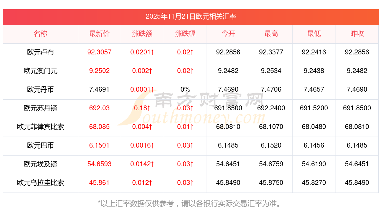 2025年11月21日最新消息,欧元兑换丹币最新汇率为7.469100,今开为7.4690,昨收为7.4690,最高为7.4706,最低为7.4657。