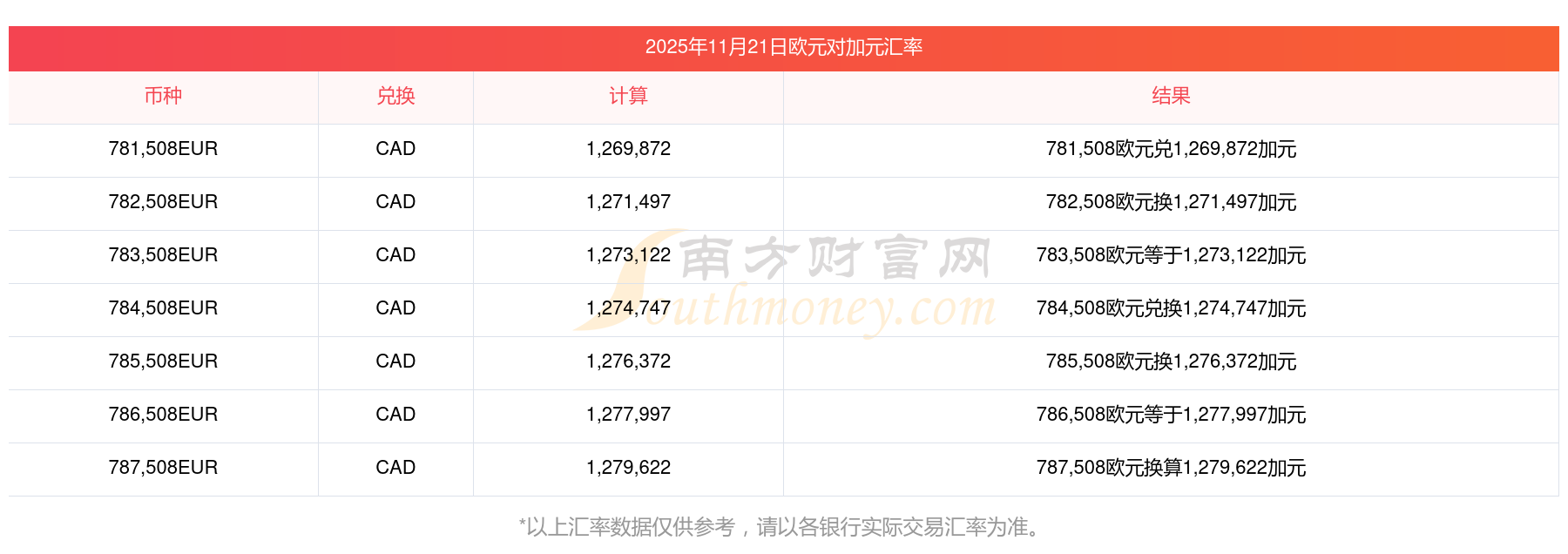 今日结汇多少?欧元对加元汇率一表2025年11月21日
