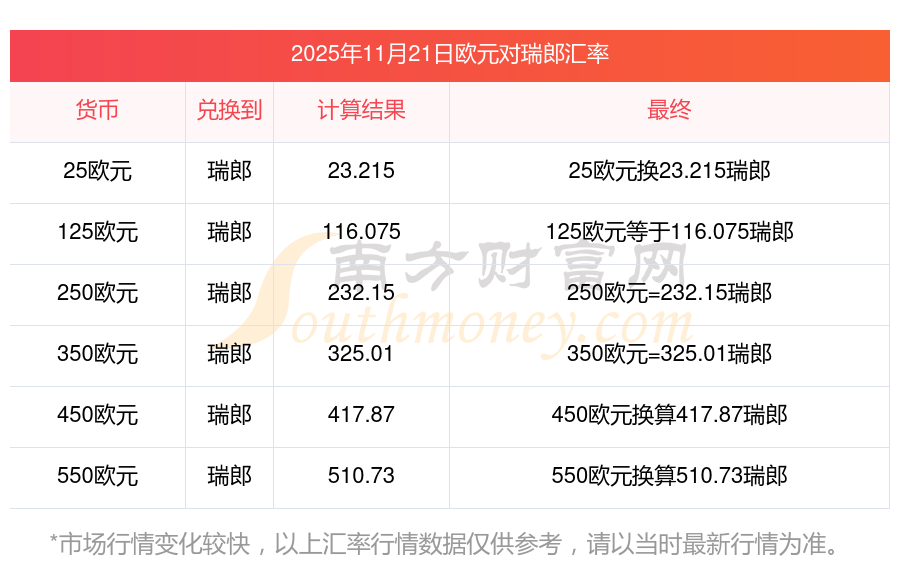 汇率查询 | 6万欧元转换瑞郎汇率是多少? 11-21