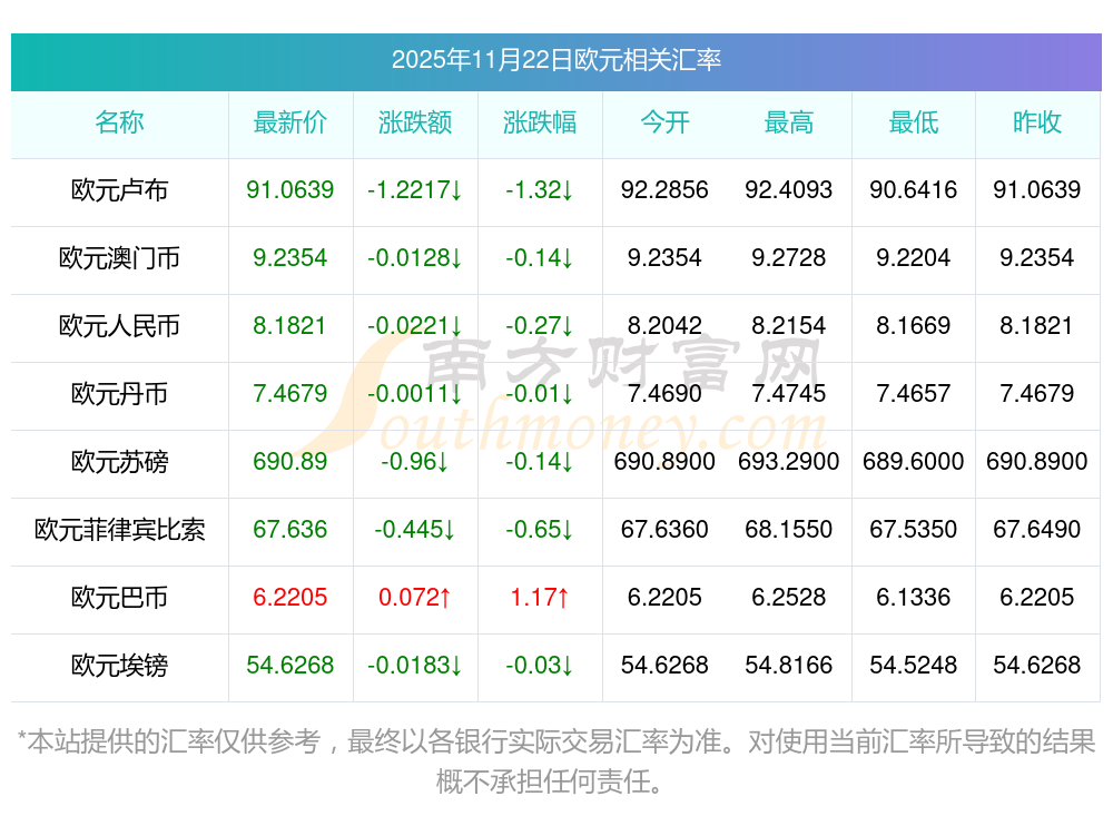 2025年11月22日欧元相关汇率查询