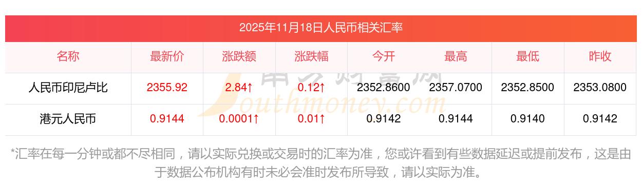 根据2025年11月18日汇率,人民币兑换印尼卢比汇率最新价2355.920000,今开价2352.8600,昨收价2353.0800,最高价2357.0700,最低价2352.8500。