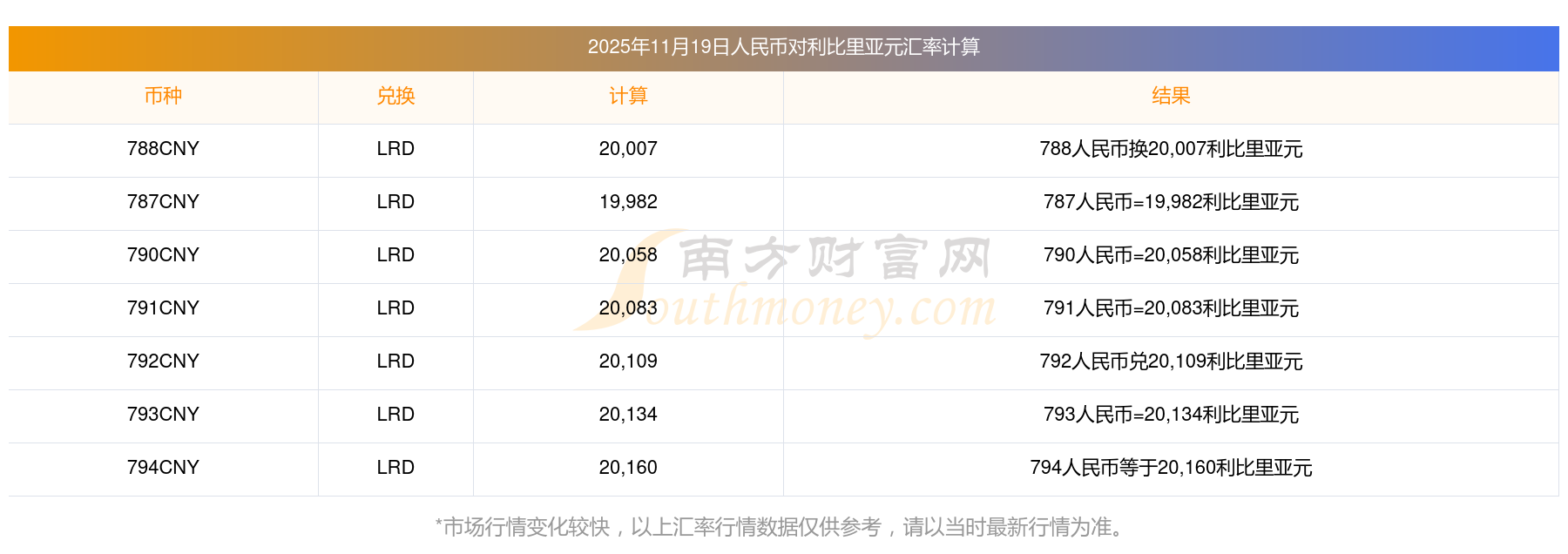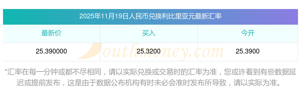 今日人民币汇价:2025年11月19日21人民币兑利比里亚元汇价一览表