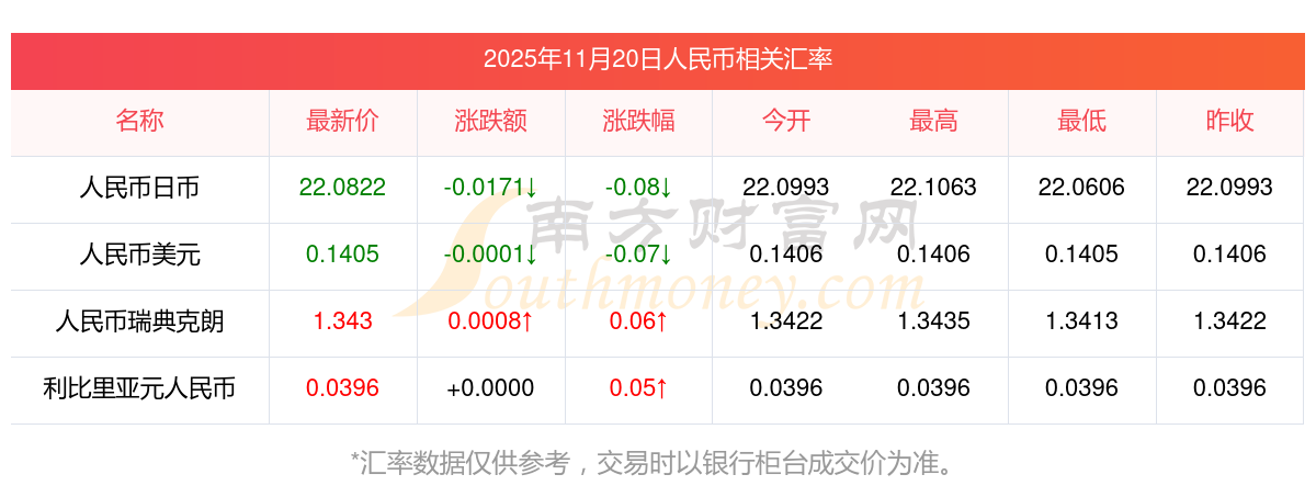 根据2025年11月20日汇率,人民币兑换瑞典克朗汇率最新价1.343000,今开价1.3422,昨收价1.3422,最高价1.3435,最低价1.3413。