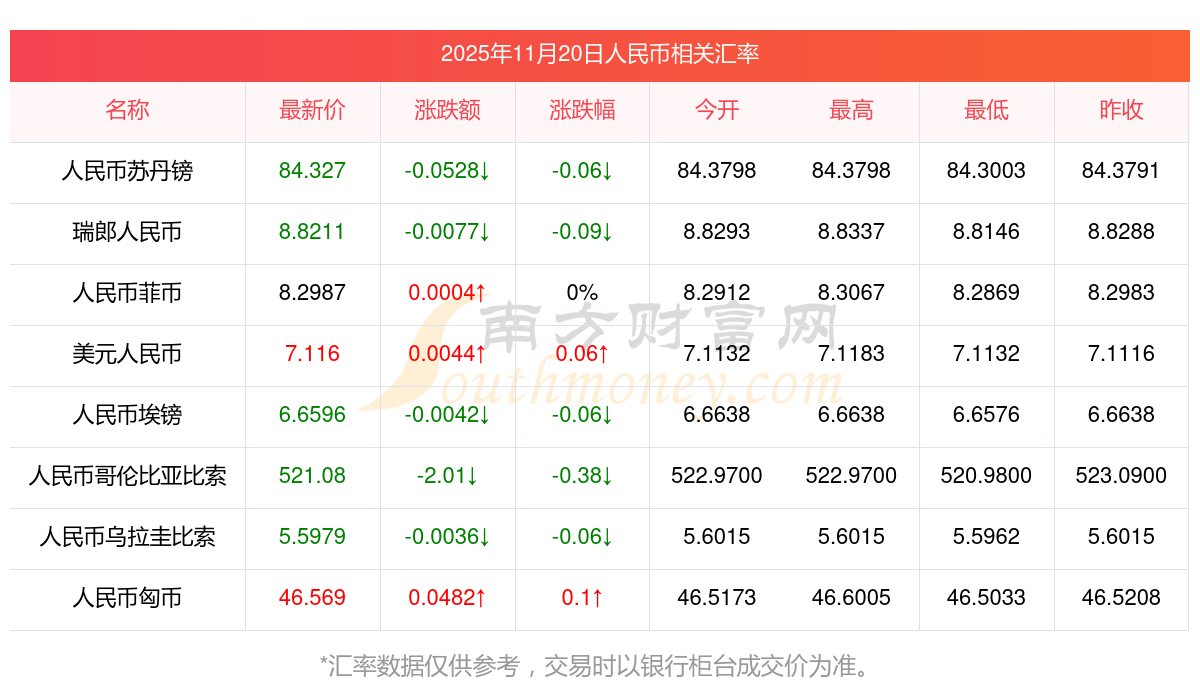 2025年11月20日人民币相关汇率查询