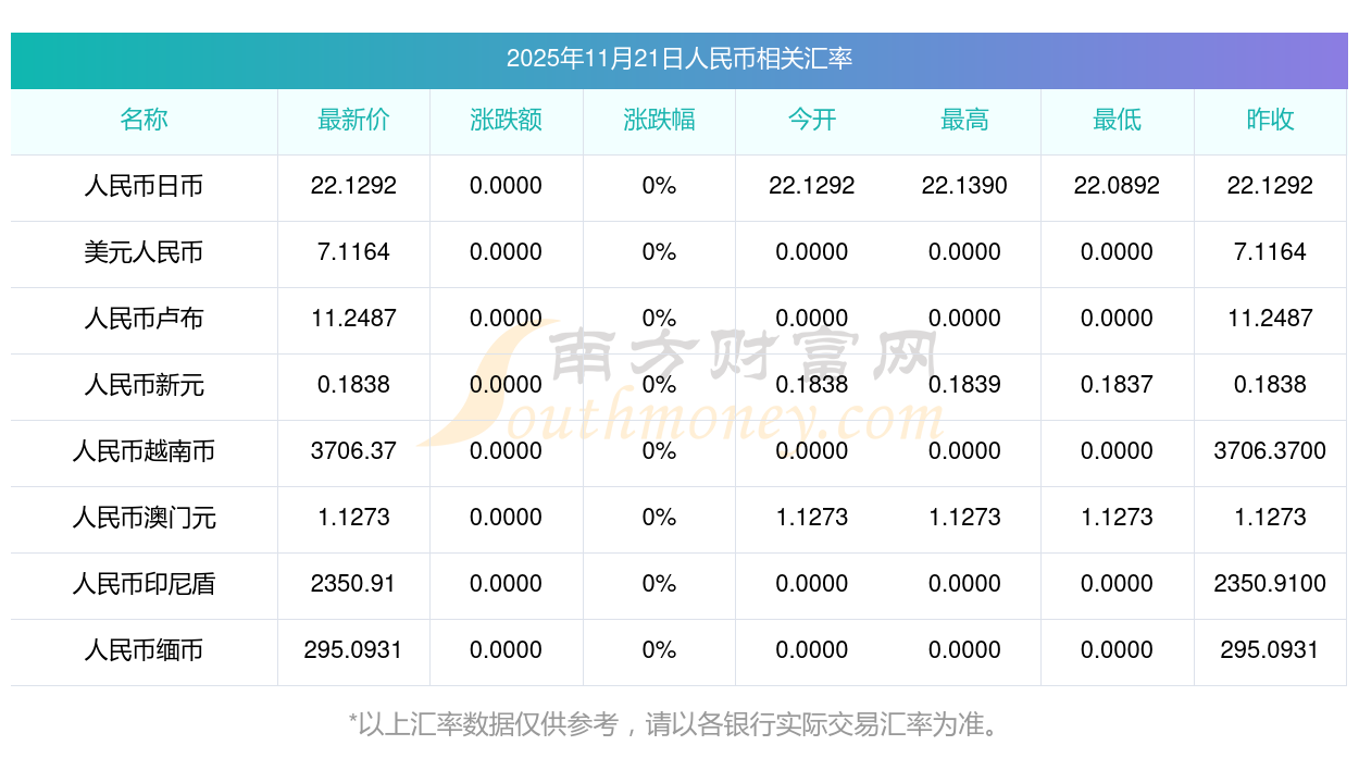 2025年11月21日人民币相关汇率查询
