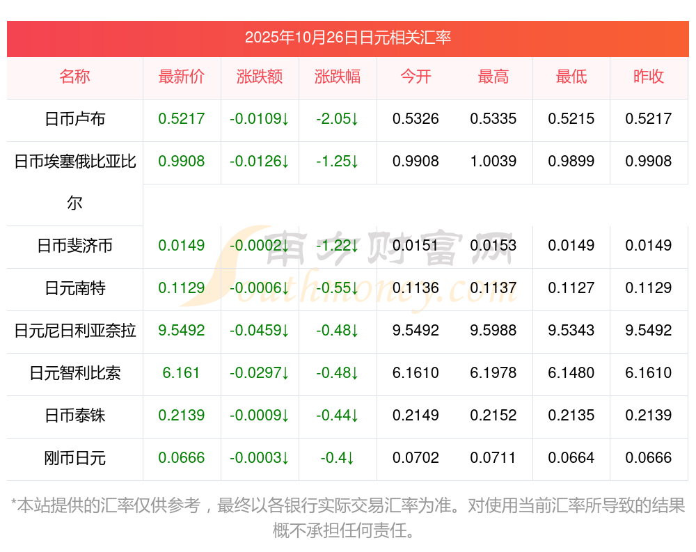 根据2025年10月26日汇率计算,日元兑换缅元汇率最新价13.737200,今开价13.7638,昨收价13.7372,最高价13.7859,最低价13.7188。