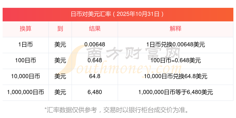 根据今日汇率:1日币、2日币、3日币、4日币、5日币、6日币、7日币、8日币、9日币、10日币,分别折合美元0.00648、0.01296、0.01944、0.02592、0.0324、0.03888、0.04536、0.05184、0.05832、0.0648美元。