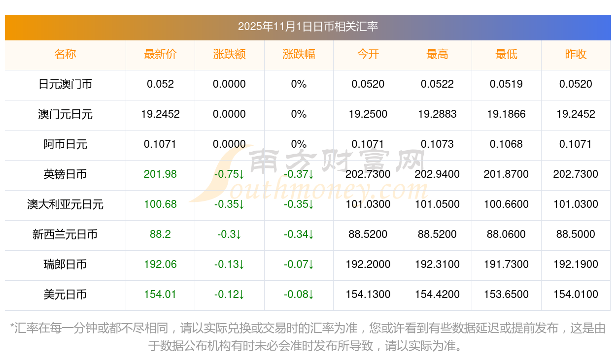 根据2025年11月1日汇率,日币兑换兰特汇率最新价0.112172,今开价0.1122,昨收价0.1125,最高价0.1129,最低价0.1120。