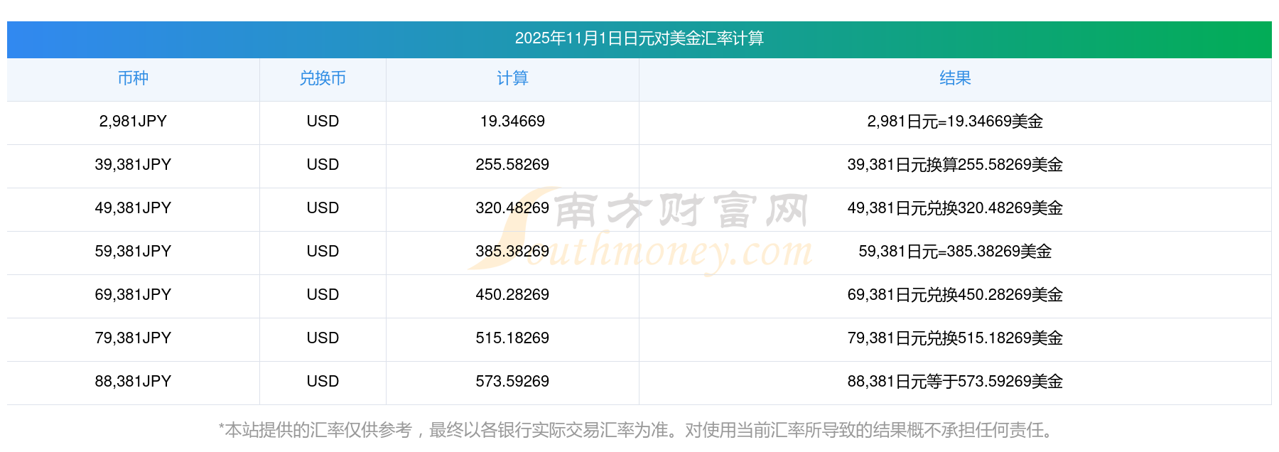 2025年11月1日,货币兑换:10日元=0.00649美金。举例:假如一块面包需要10日元,则需美金:0.00649美金。
