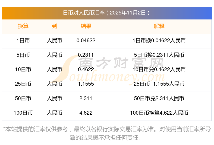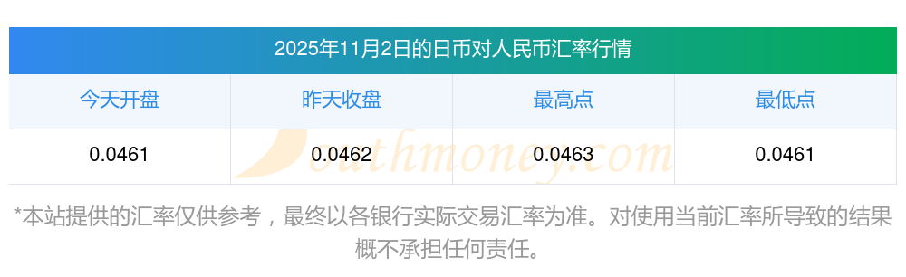 2025年11月2日日币汇价:6日币兑人民币汇价表