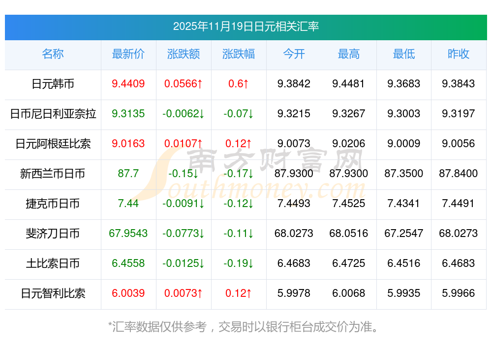 2025年11月19日最新消息,日元兑换瑞郎最新汇率为0.005152,今开为0.0051,昨收为0.0051,最高为0.0052,最低为0.0051。
