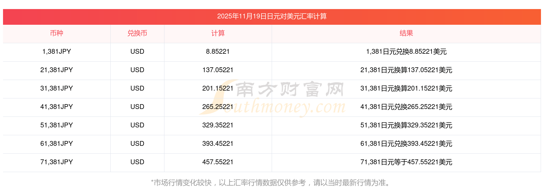 今天2025年11月19日最新汇率计算查询: