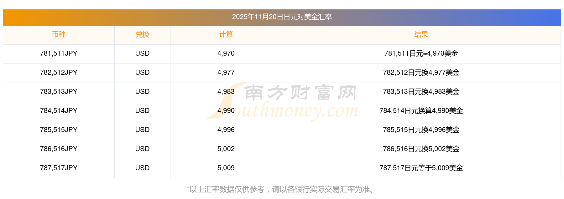 现在1100日元与美元的汇率是多少?2025年11月20日