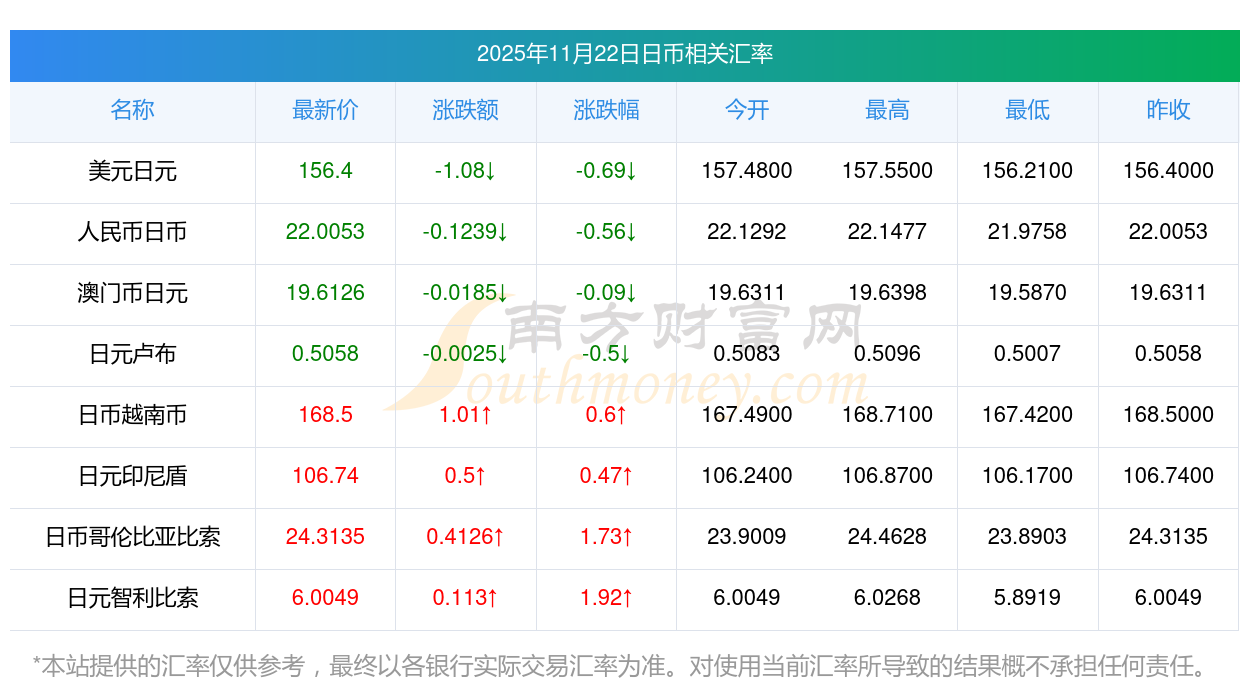 根据2025年11月22日汇率,日币兑换兰币汇率最新价0.111105,今开价0.1094,昨收价0.1111,最高价0.1117,最低价0.1093。