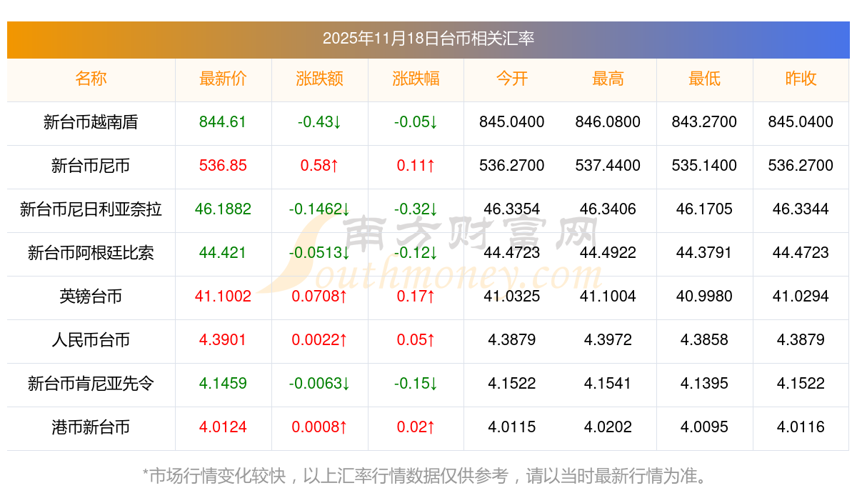 根据今天2025年11月18日汇率计算,TWD兑换MYR汇率最新价0.133818,今开价0.1331,昨收价0.1331,最高价0.1339,最低价0.1330。