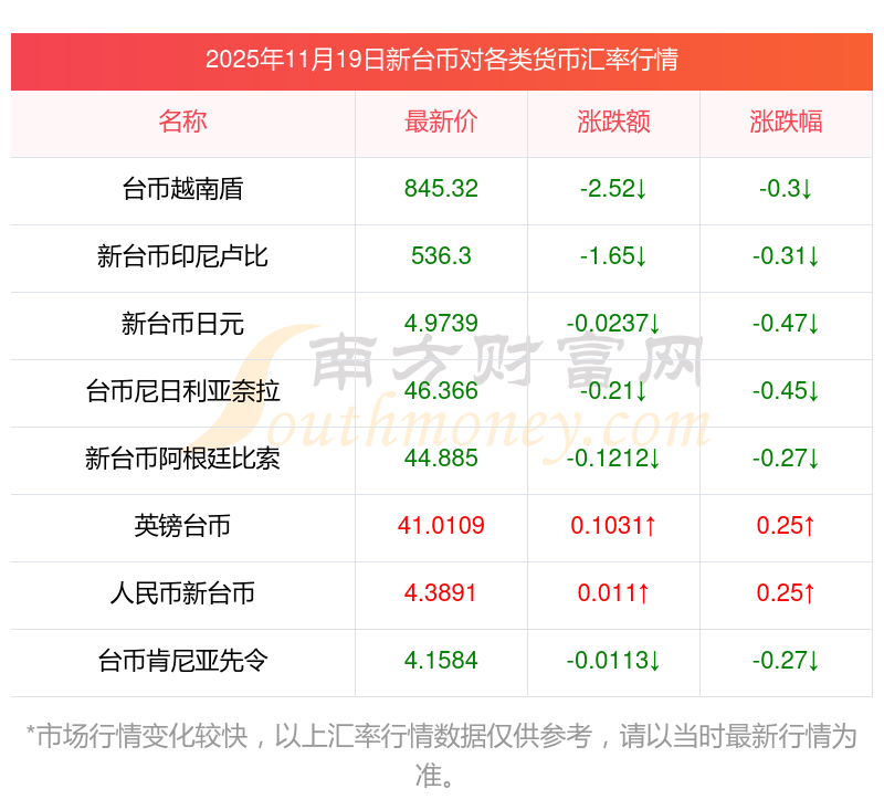 根据2025年11月19日汇率计算,TWD兑换EGP汇率最新价1.511502:今开价1.5155,昨收价1.5155,最高价1.5161,最低价1.5088。